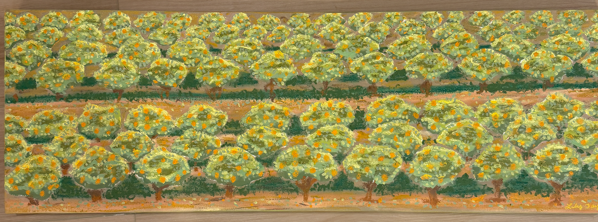 Acrylic and oil pastel mixed-media painting on 12 x 36 inch canvas